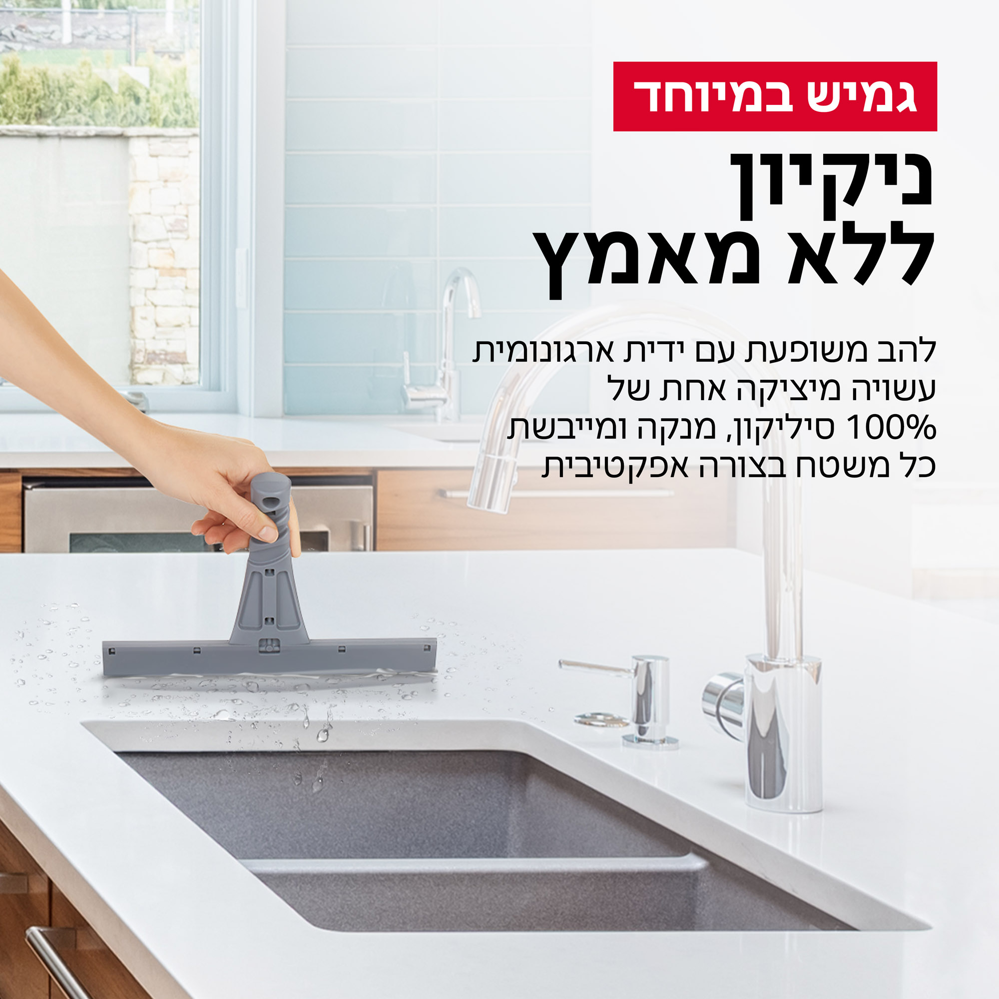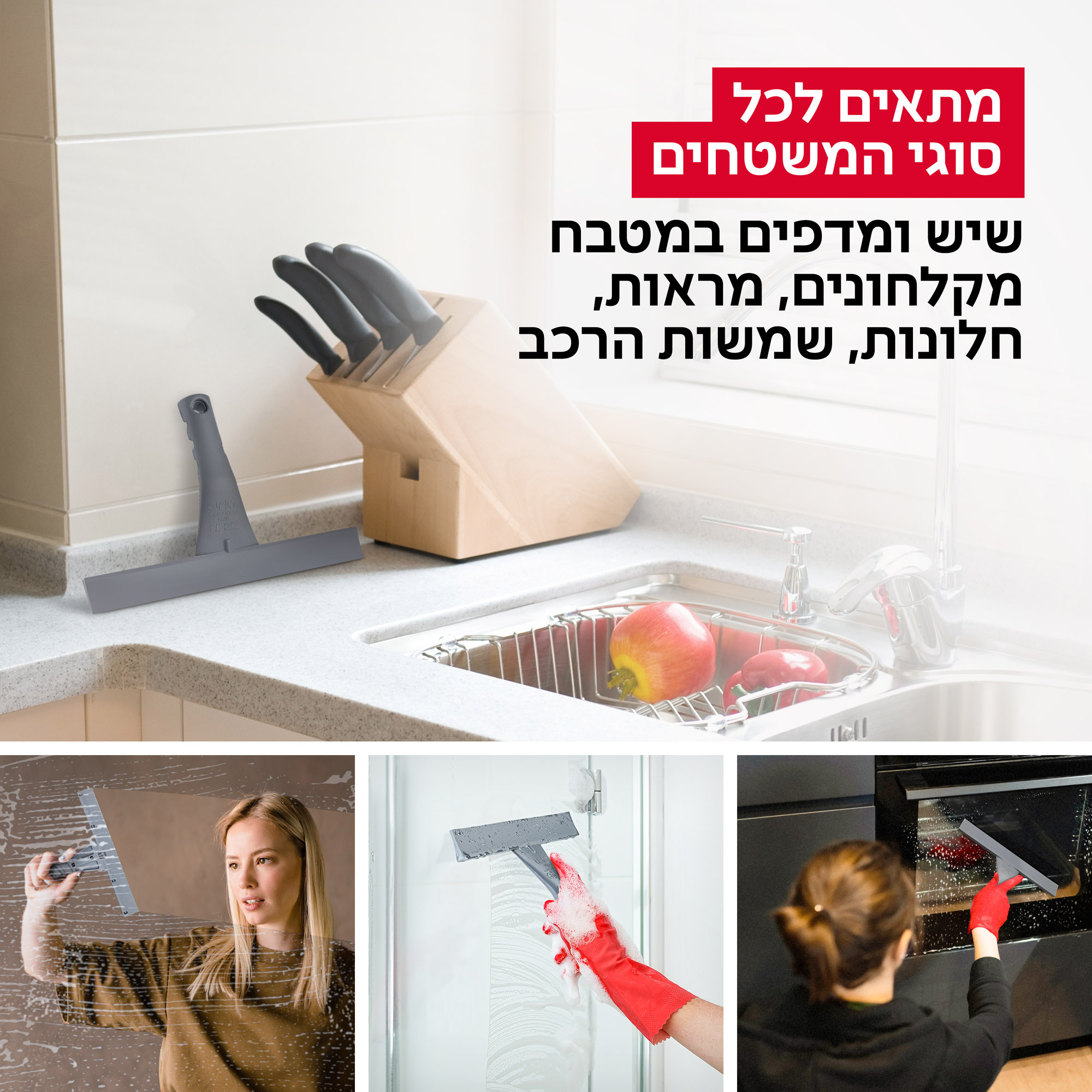 מגב קטן ברוחב 24 ס”מ, גובה (כולל ידית) 17 ס”מ, מתאים במיוחד לניקוי וייבוש שיש המטבח, דלת המקלחון, שמשות הרכב או חלונות בבית.